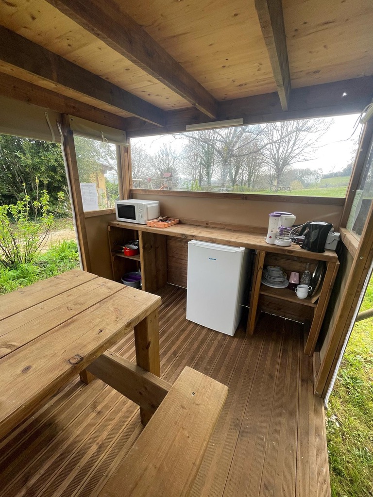 Sous la petite terrasse couverte et grâce à une table de pique-nique, appréciez un moment de détente, dégustez vos petits déjeuners au soleil en